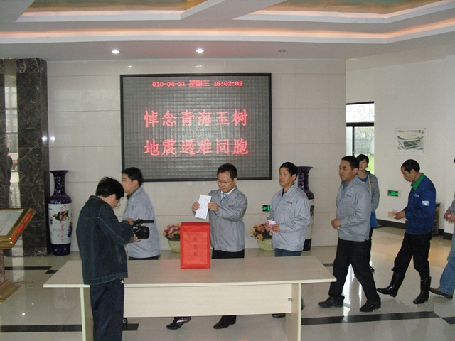 2010年4月14日青海玉樹發(fā)生里氏7.1級地震,災區(qū)的信息牽動著公司每個員工的心,公司員工陸續(xù)通過各種方式向地震災區(qū)表達自己的一份心意。4月21日舉國哀悼,下午4:00,公司組織員工對青海玉樹的同胞們進行捐款,捐款前公司員工對地震中的遇難者進行默哀。共有326人參與本次活動,所得善款共計15885元,善款將通過銅陵市紅十字會送達災區(qū)。